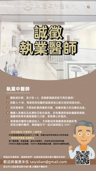 我們雖然沒辦法代訓, 行政團隊年輕好溝通, 【排班需求】 需要您能配合 夜診與週末診 ,但會與其他醫師一同分配! 確認入職後,會與其他醫師協調共同確認班表! 【薪資福利】 含三節禮金及年終獎金 至少 診+4 保障,其他抽成細項可面談 無業績壓力、不硬推療程 【診所特色】 位於捷運海山站步行 5 分鐘 診所門口有機車格 步行 3 分鐘有公有停車場 環境新穎,設備及服務齊全 基本設備:遠紅外線燈、低週波電療儀、藥草薰蒸機 OMRON 隧道式血壓機 TANITA 專業型體組成計 MC-780MA 多頻道雷射暨電刺激治療儀(雷射針灸機) 每日提供新鮮養生茶免費飲用 工作氣氛佳且團隊合作優良 聘有護理師協助醫師 無推拿師 → 無紛爭、無配合問題 醫師完全自由發揮,不受限針數/克數 患者素質佳 患者與工作夥伴間互動良好 完全合法、安全透明 堅持正派經營 絕無盜刷健保卡、詐領保險等問題 醫師能安心長期配合 【我們期待的你】 想長期發展並經營在地專屬客群 喜歡乾淨、穩定、有制度的診所 想在無壓力環境下好好看診 或想研發新療程(美顏針/針傷/埋線) 剛畢業也非常歡迎! 【應徵方式】
